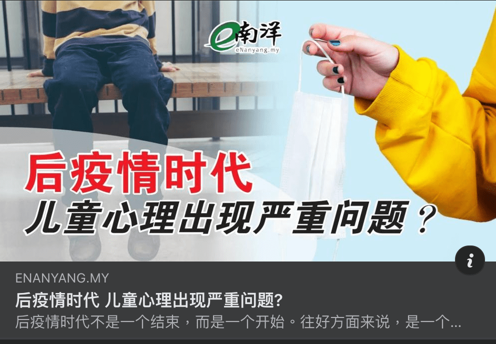 受邀于南洋商报的访问刊登了!其实不止心理问题,孩子的语言、交际与沟通能力、情绪管理等,都受到了一定程度的影响。