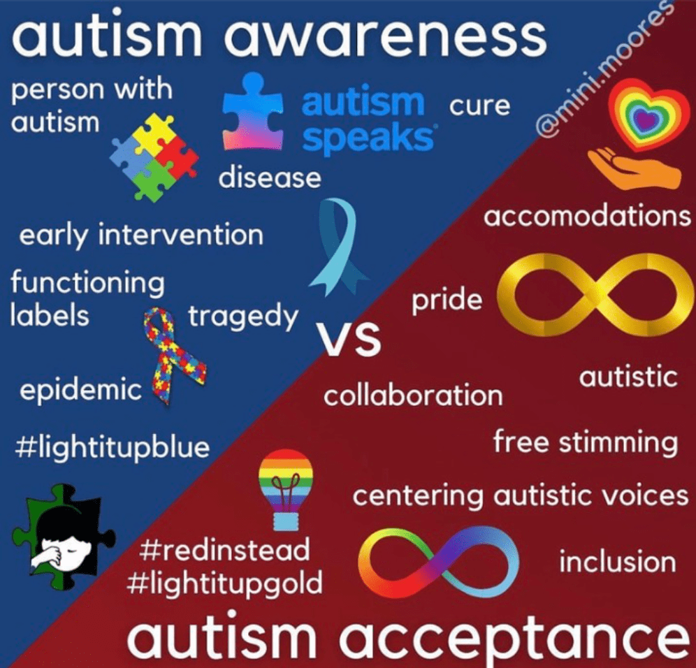“Autistic people aren’t a monolith – everyone has their preference for what terminology they find empowering. Still, many support the shift from autism “awareness” to “acceptance.”