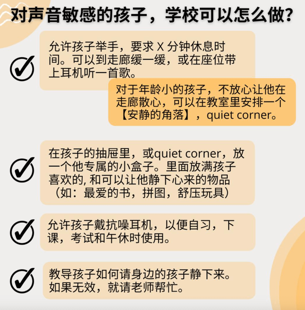 我治疗的很大一部分,就是帮孩子和学校/大学争取资源。如果家长不敢和老师说,我会制图或写简单的报告,鼓励家长和老师分享我推荐的抗噪和应对方式。还是不行,我会直接和学校联系。所以,家长也可以和你们的治疗师或医生沟通,请求帮忙。