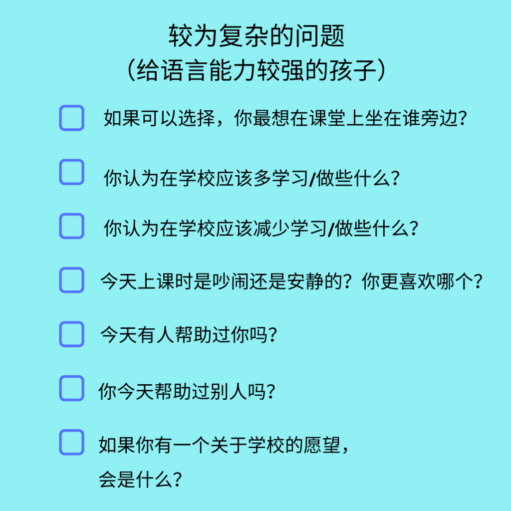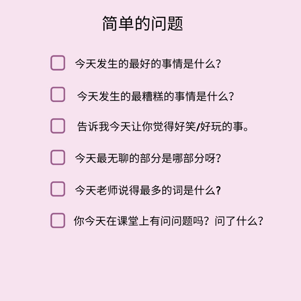 这里提供大家几个话题(有简易版和较为复杂的问题),让孩子更为具体的分享学校发生的事。在和孩子交流的过程中,可以